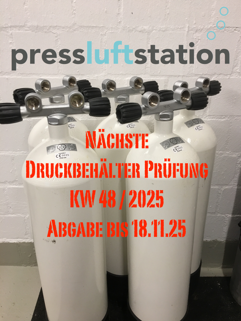 Der nächste Abgabetermin zur Behälterprüfung rückt näher. Die Abgabe ist bis einschließlich 18.11.2025 bei uns an der Füllstation Empelde möglich. Rechtzeitige Anmeldung erforderlich!